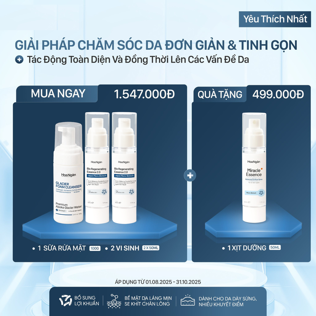 Combo 4 mỹ phẩm vi sinh Hoa Ngân được thiết kế như một liệu trình chăm sóc chuyên sâu, giúp tái thiết làn da đang gặp vấn đề về mất cân bằng tự nhiên. Với sự kết hợp giữa sữa rửa mặt nước băng Glacier Foam Cleanser, tinh chất vi sinh Hoa Ngân 2.0 và xịt dưỡng Miracle Essence, combo mang đến hiệu quả phục hồi, nuôi dưỡng và bảo vệ da từ bên trong.