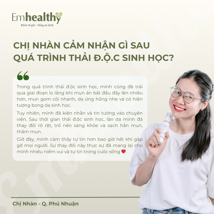 “Sau 3 tháng theo chuyên viên Emhealthy, da mình không còn sần đỏ, sạch hẳn mụn, da láng mịn, trong suốt, khỏe khoắn. Giờ ra ngoài chỉ cần thoa mốt lớp kem chống nắng mỏng, mình cũng không cần phải makeup che khuyết điểm nữa.”
