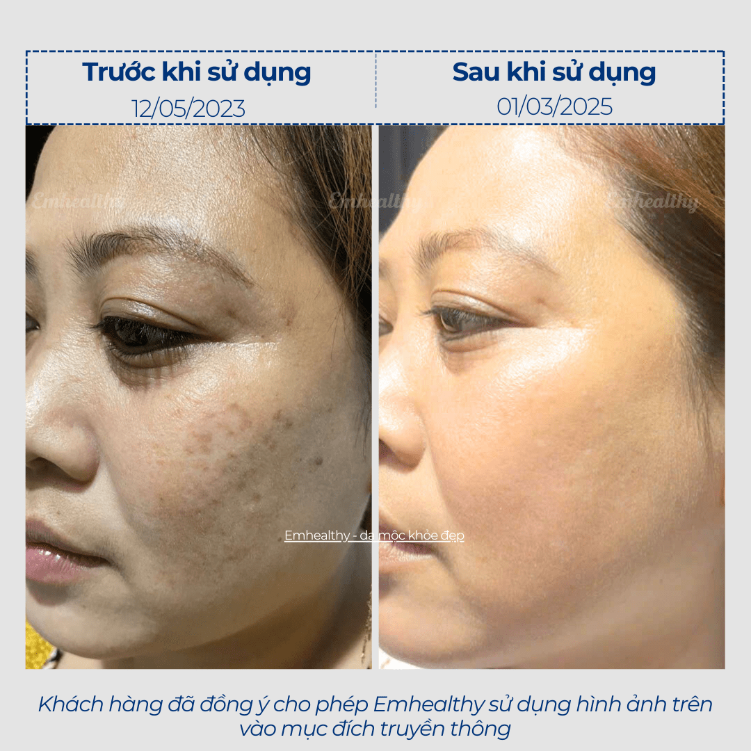 May mắn là chị được các bạn chuyên viên ở Emhealthy đồng hành, chăm sóc rất tận tâm và kiên trì. Từng chút một, làn da chị dần hồi phục — giờ da đã khỏe mạnh, hồng hào và sạch nám.