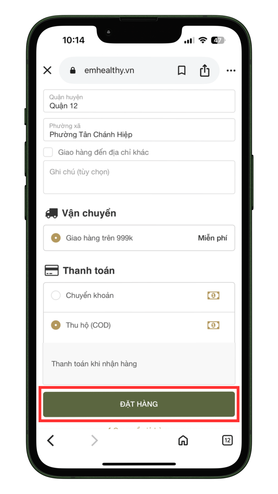 Bước 4: Nhập mã khuyến mãi (nếu có) và điền các thông tin của bạn để nhận đơn hàng, lựa chọn hình thức thanh toán và vận chuyển cho đơn hàng của mình. Kiểm tra lại đơn hàng và ấn Đặt hàng